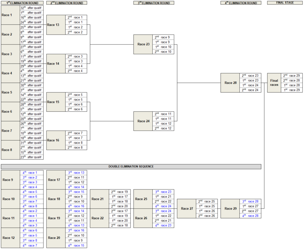本戦(Elimination Round)ラウンド(1レース)で上位2名の選手と、敗者復活(Double Elimination sequence)の最終ラウンド(1レース)で上位2名の選手が決勝に進出し1位から4位までの最終順位が決定されます。